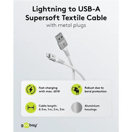 Goobay Lightning-USB-A supersoft textilkabel med metallkontakter, 0,5 m, vit MFi-certifierad, elegant och extra robust laddnings- och synkroniseringskabel för Apple iPhone/iPad (vit)