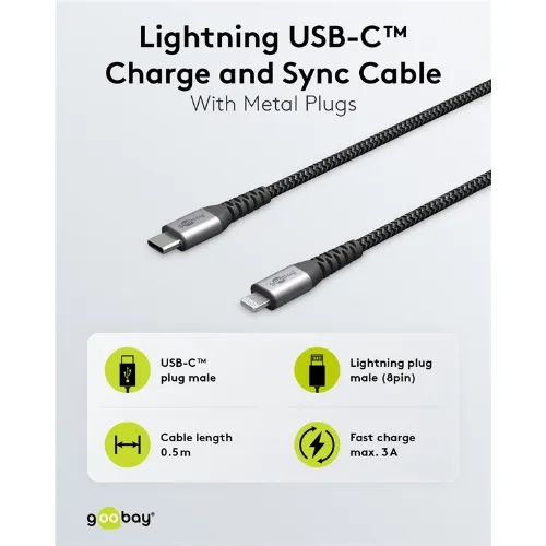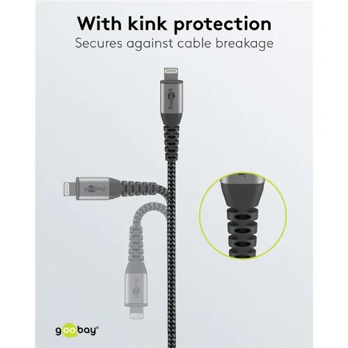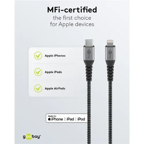 Goobay Lightning-USB-C™ textilkabel med metallkontakter, 2 m MFi-certifierad, elegant och extra robust laddnings- och synkroniseringskabel för Apple iPhone/iPad (svart, grå)