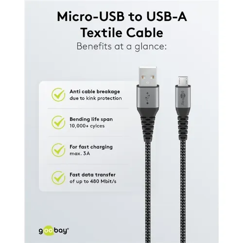 Goobay Micro-USB till USB-A textilkabel med metallkontakter 2 m elegant och extra robust anslutningskabel för enheter med Micro-USB-anslutning