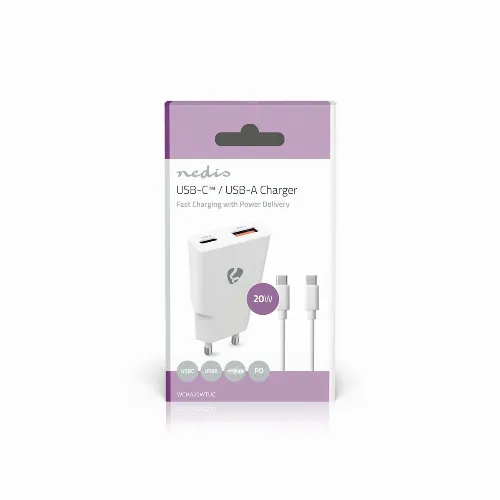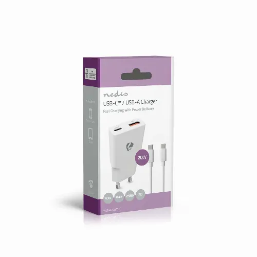 Nedis Väggladdare | 20 W | GaN | PD3.0 | 1.5 / 2.0 / 2.22 A / 3.0 A | Antal utgångar: 2 | USB-A / USB-C™ | USB-C™ (Lös) Kabel | 1.50 m | Automatiskt val av Spänning | Vit