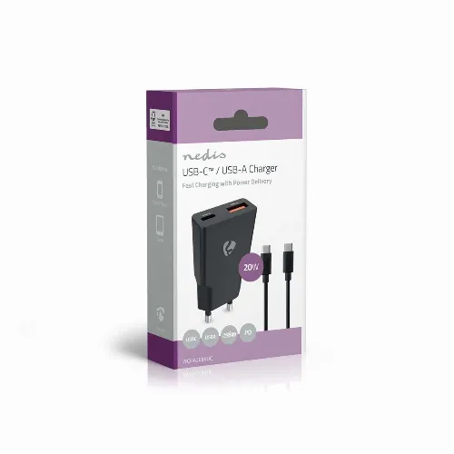 Nedis Väggladdare | 20 W | GaN | PD3.0 | 1.5 / 2.0 / 2.22 A / 3.0 A | Antal utgångar: 2 | USB-A / USB-C™ | USB Type-C™ (Lös) Kabel | 1.50 m | Automatiskt val av Spänning | Svart