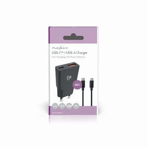Nedis Väggladdare | 30 W | GaN | PD3.0 | 1.5 / 2.0 / 2.5 / 3.0 A | Antal utgångar: 2 | USB-A / USB-C™ | USB Type-C™ (Lös) Kabel | 1.50 m | Automatiskt val av Spänning | Svart