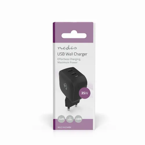 Nedis Väggladdare | 35 W | GaN | PD3.0 | 1.75 / 2.33 / 2.92 / 3.0 A | Antal utgångar: 2 | 2x USB-C™ | Automatiskt val av Spänning | Svart