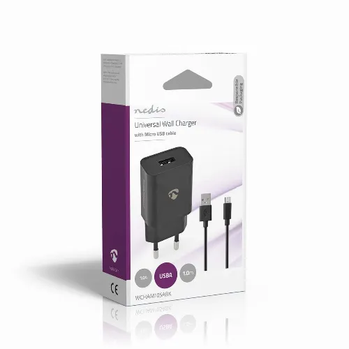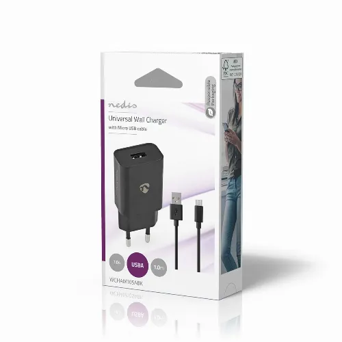 Nedis Väggladdare | 5 W | 1.0 A A | Antal utgångar: 1 | USB-A | Micro USB (Lös) Kabel | 1.00 m | Single Voltage Output | Svart