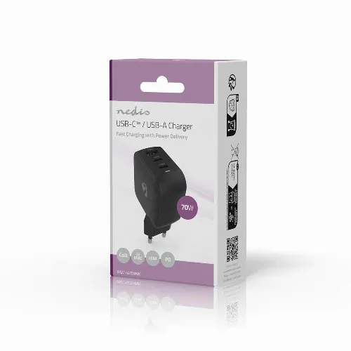 Nedis Väggladdare | 70 W | GaN | PD3.0 | 1.5 / 2.25 A / 2.5 / 3.0 / 3.5 A | Antal utgångar: 3 | USB-A / 2x USB-C™ | Automatiskt val av Spänning | Svart